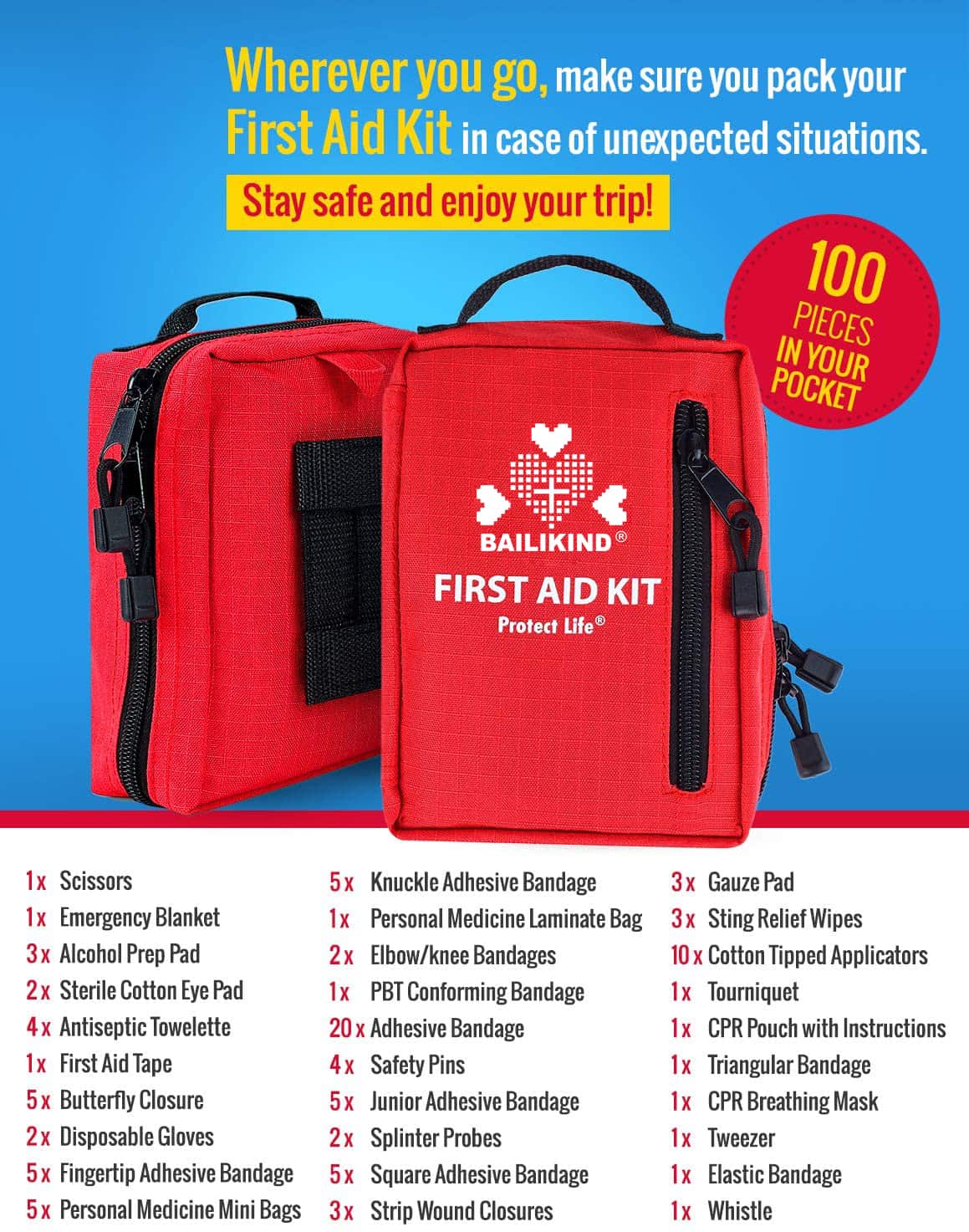 කඳවුරු බැඳීම සඳහා සැහැල්ලු ප්රථමාධාර කට්ටලයක් යෙදීම: එය රැගෙන යාමට පහසු වන අතර නිවැරදි ප්රමාණයෙන් යුක්ත වන අතර එමඟින් ඔබේ නිවසේ වෛද්ය කැබිනට්ටුව, විද්යාල නේවාසිකාගාරය, බග් අවුට් බෑගය, මෝටර් රථය, ආර්වී, බයිසිකලයකට සම්බන්ධ කිරීම සඳහා පහසුවෙන් ගබඩා කළ හැකිය. යතුරුපැදිය.