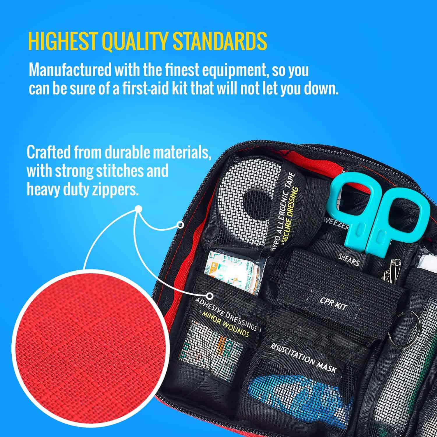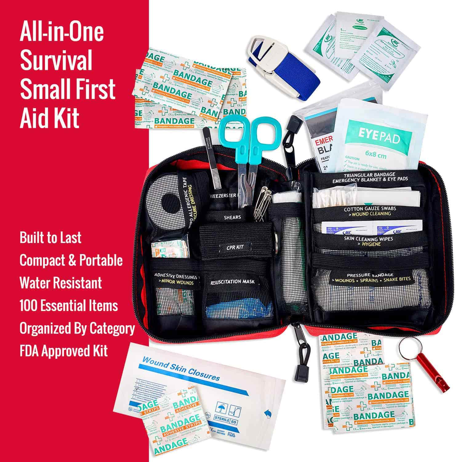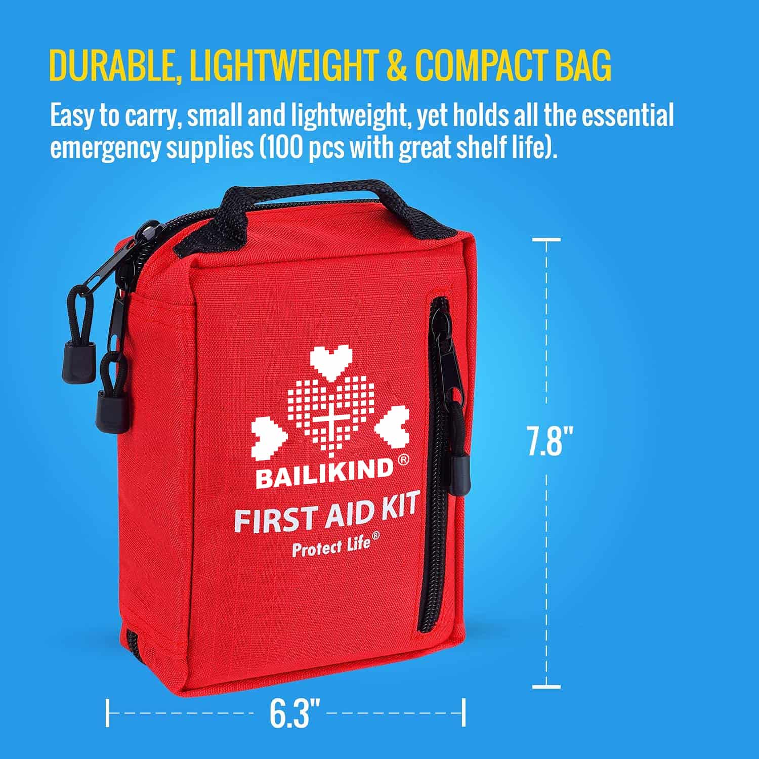 දැඩි සහ සංයුක්ත බෑගය (අඟල් 7.8 x 6.3 x 2.7, බර රාත්තල් 1.02 ක් පමණි), හදිසි ප්රථමාධාර කට්ටලය 600D රිප්ස්ටොප් පොලියෙස්ටර් සහ ශක්තිමත් සිපර් සමඟ නිර්මාණය කර ඇත. එය රැගෙන යාමට පහසු වන අතර නිවැරදි ප්රමාණයෙන් යුක්ත වන අතර එමඟින් ඔබට එය බයිසිකලයකට හෝ යතුරුපැදියකට සම්බන්ධ කිරීම සඳහා ඔබේ නිවසේ වෛද්ය කැබිනට්ටුව, විද්යාල නේවාසිකාගාරය, බග් අවුට් බෑගය, මෝටර් රථය, ආර්වී තුළ පහසුවෙන් ගබඩා කළ හැකිය.